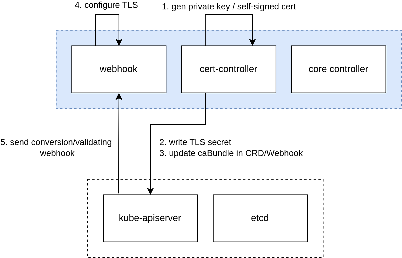 Cert-controller is responsible for (1) generating TLS credentials which will be used by the webhook component and (2) injecting the certificate as caBundle into Kind=CustomResourceDefinition for conversion webhooks and Kind=ValidatingWebhookConfiguration for validating admission webhook. The TLS credentials are stored in a Kind=Secret which is consumed by the webhook.
