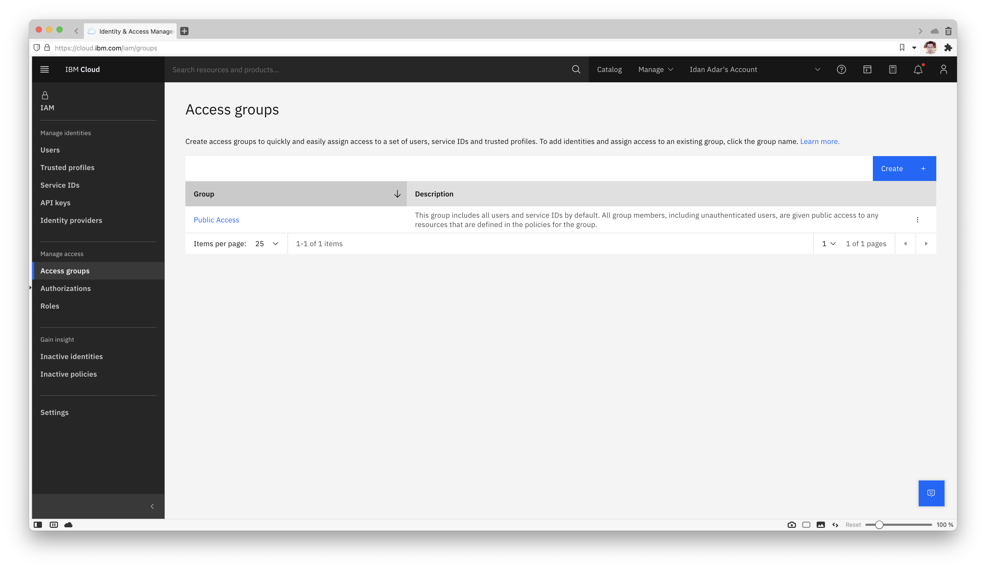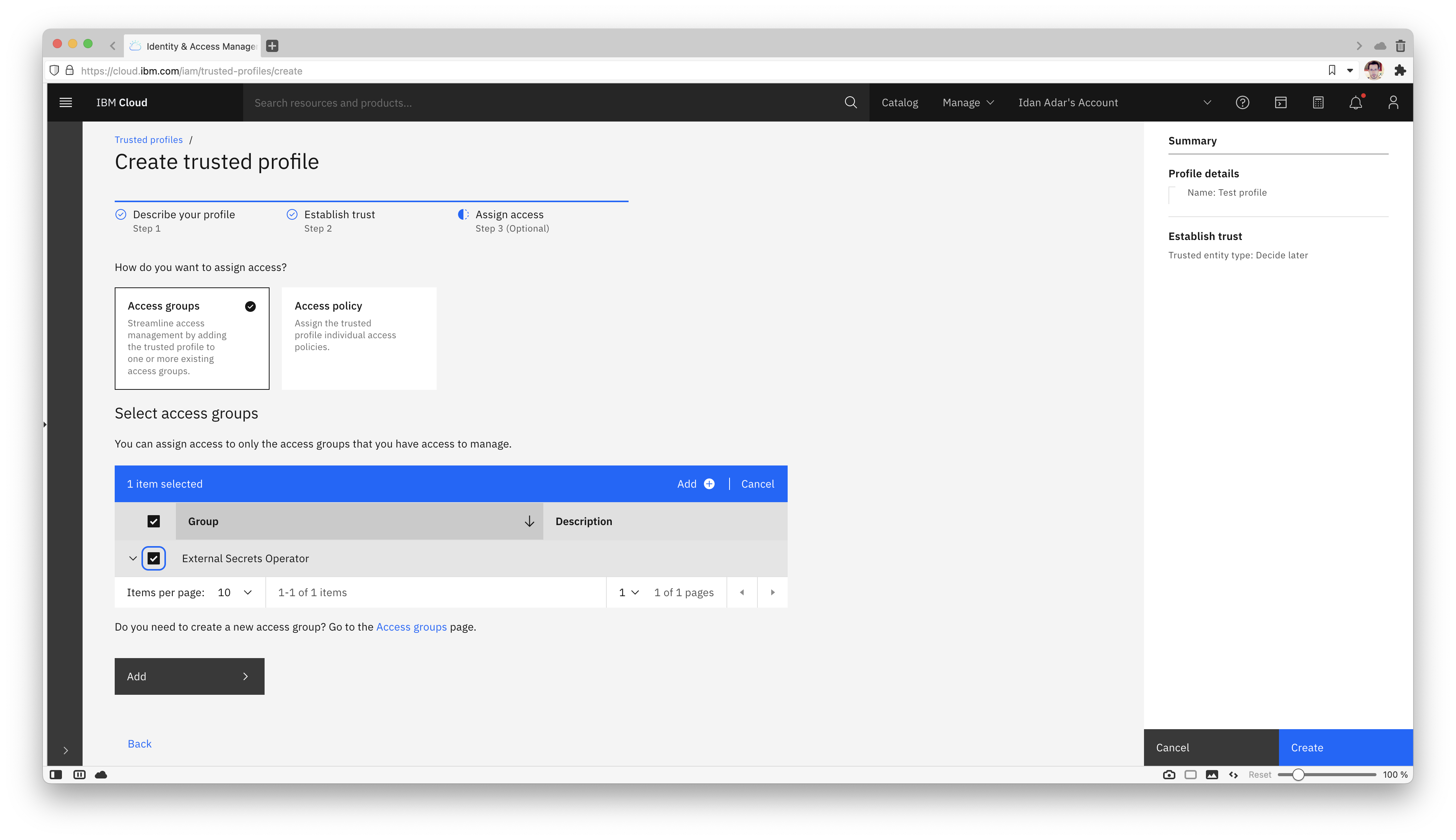 Click "Add" next to the previously created access group and then "Create", to associate the necessary service permissions.