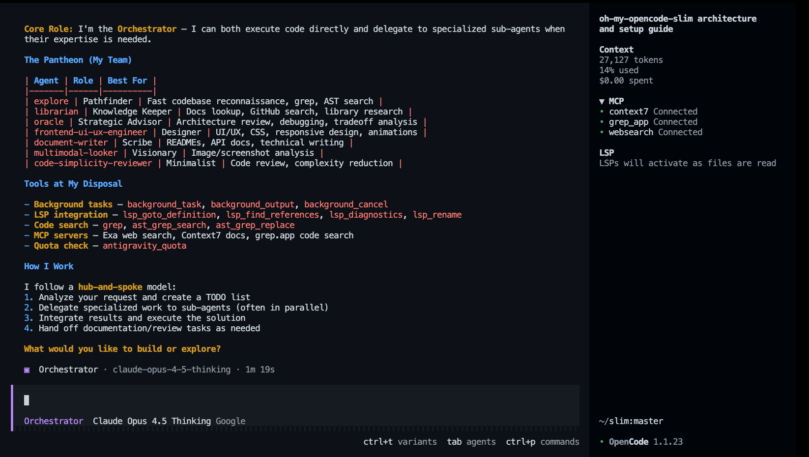 @explore background task to find all auth-related files.@librarian task to check the latest documentation for the auth library used.@document-writer to update the README.The Orchestrator was born when the first codebase collapsed under its own complexity. Neither god nor mortal would claim responsibility - so The Orchestrator emerged from the void, forging order from chaos. They don't merely command armies; they fight alongside them. Every line of code passes through their hands before they decide which lesser deity deserves a piece of the puzzle.