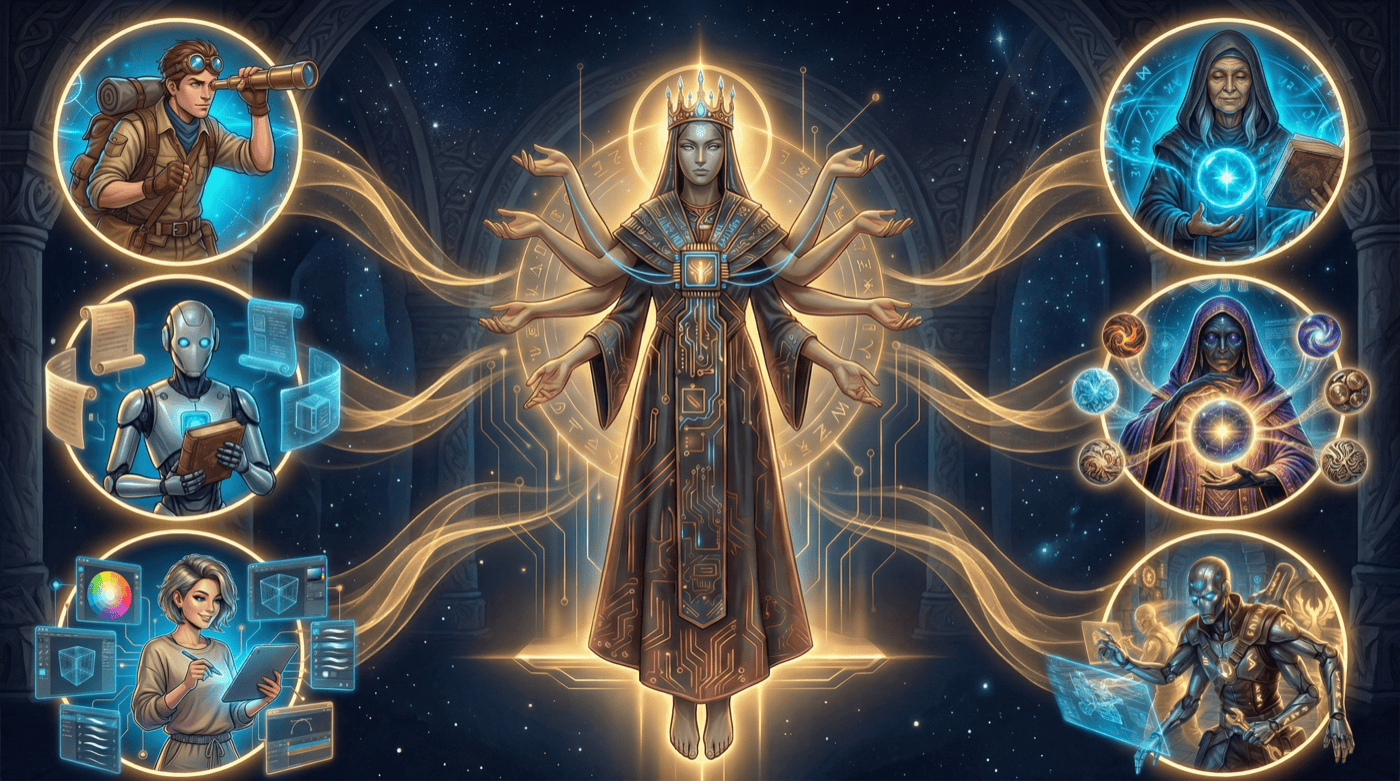 The Librarian was forged when humanity realized that no single mind could hold all knowledge. They are the weaver who connects disparate threads of information into a tapestry of understanding. They traverse the infinite library of human knowledge, gathering insights from every corner and binding them into answers that transcend mere facts. What they return is not information - it's understanding.