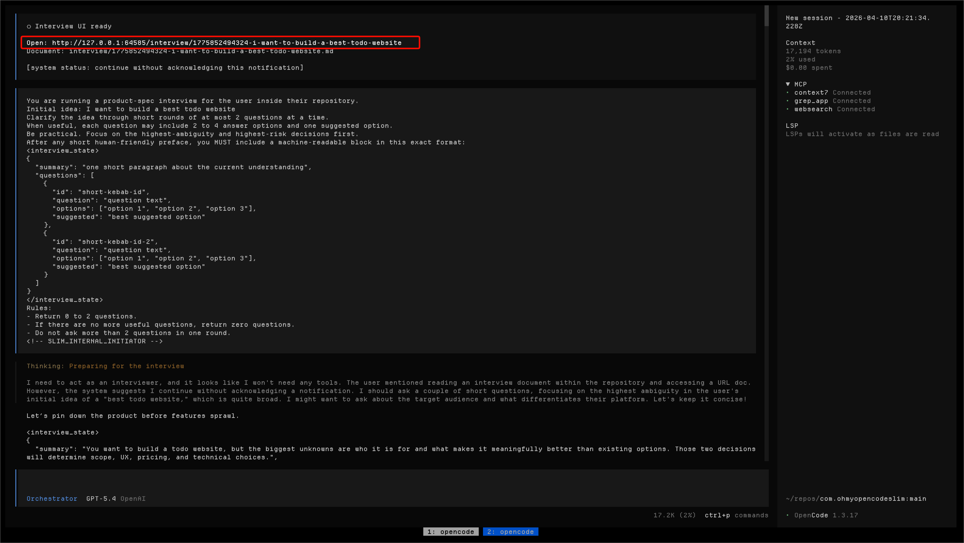 1. OpenCode starts the interview in your current session