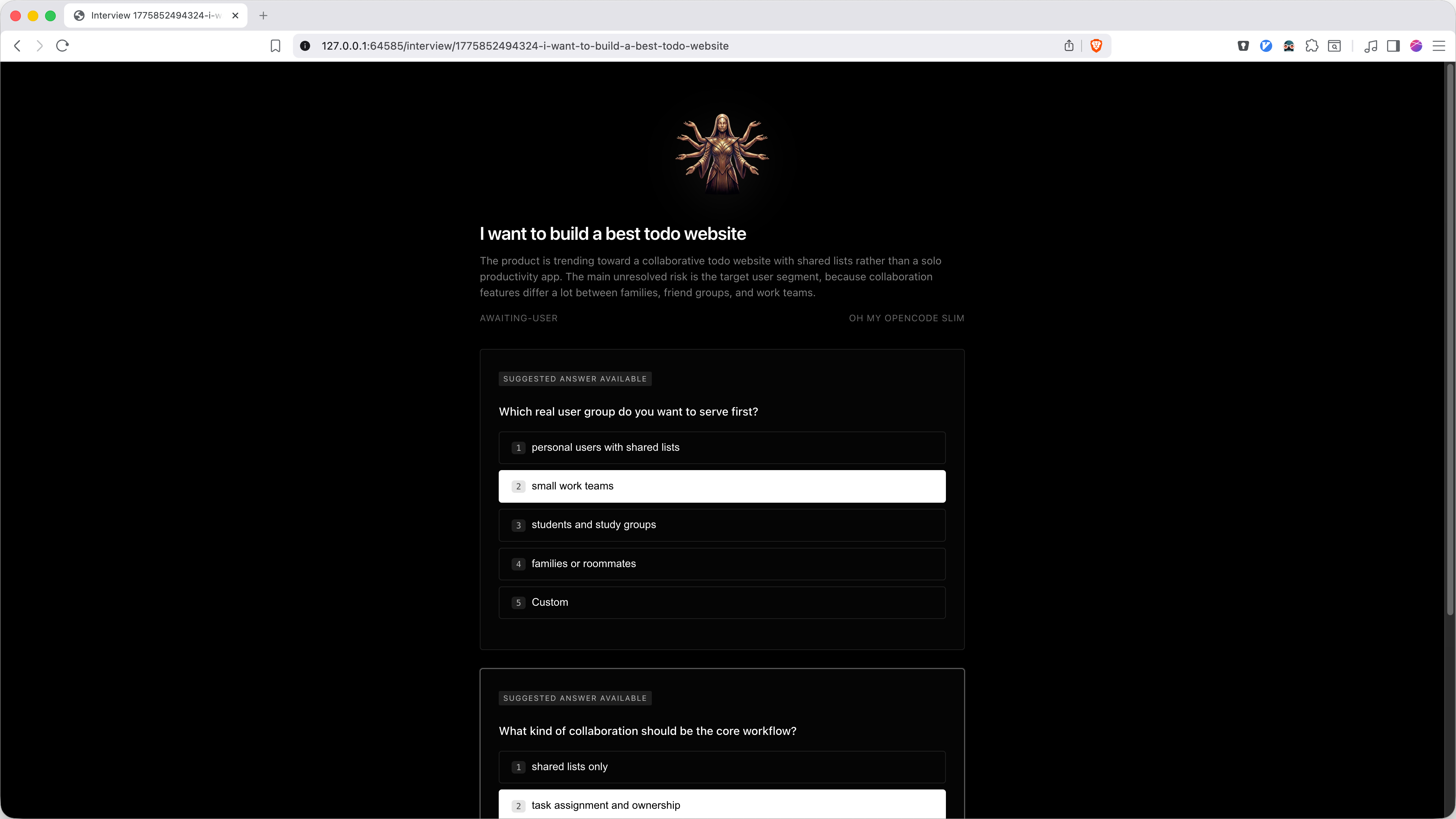 /interview opens a local browser UI for refining a feature idea inside the same OpenCode session.