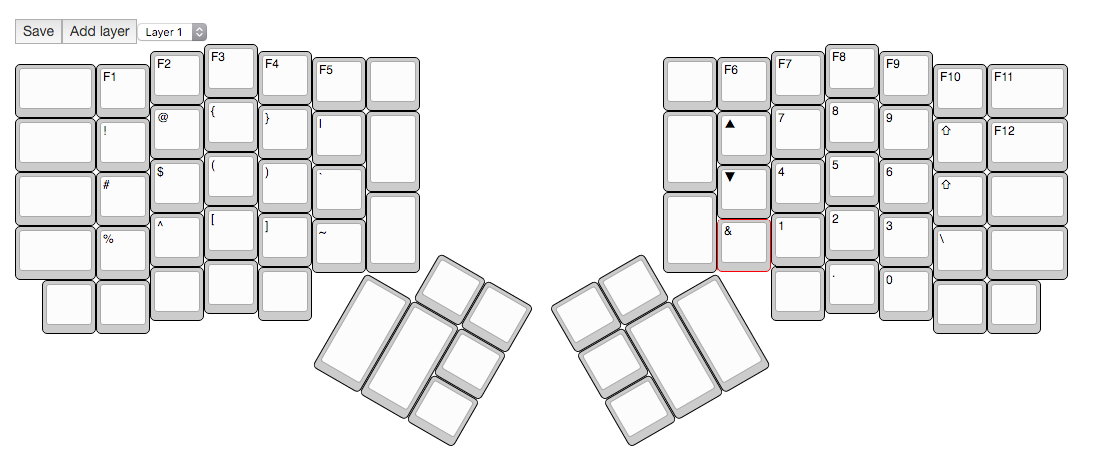 Expecting the user to rely on Coder Layer this keymap removes some of the duplicate symbol keys in the lower portions of the board and replaces them with arrow keys and modifiers. The Media Layer is also updated to match the change in the arrow keys and the left and right click buttons are moved under the thumb position. The Media layer is now reached with toggle button in the lower right.